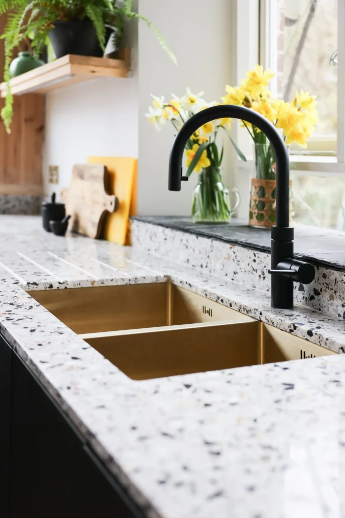 Terrazzo nach Ihren Wünschen. Erhältlich in einer breiten Palette an Standardfarben oder individuell nach Ihren Wünschen im traditionellen Handgussverfahren.